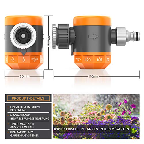 – Ein Adapter von ¾ Zoll auf 1/2 Zoll befindet sich mit im Lieferumfang Die mechanische Bewässerungssteuerung passt zu bekannten Systemen großer Hersteller