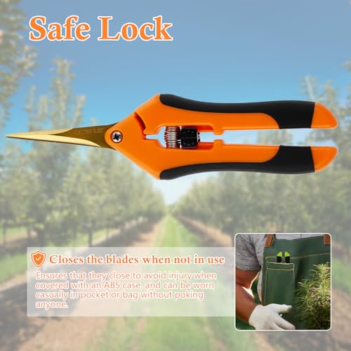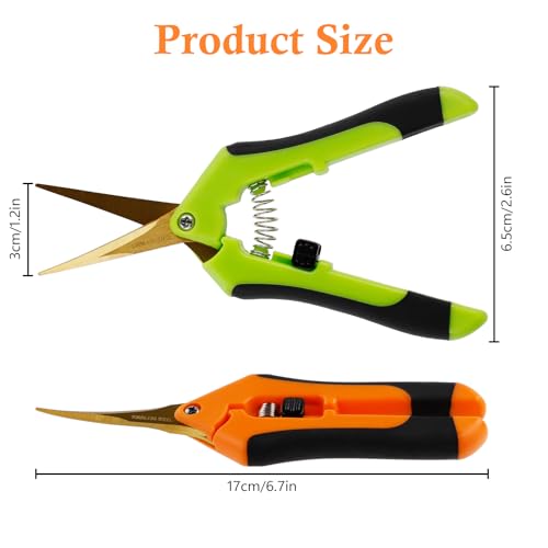 【Vielseitiges 2er-Set】 Zwei hochwertige Gartenscheren für alle Schneidaufgaben im Garten, bei Zimmerpflanzen und in der Küche. Ideal für Blumen, Kräuter, Gemüse und leichte Gehölzpflege. • 【Präzise & Langlebig】 Titanbeschichtete, gebogene Edelstahlklingen für präzise und saubere Schnitte. Die robuste Konstruktion garantiert eine lange Lebensdauer. Speziell geformte Klingen verhindern versehentliches Quetschen von Pflanzenteilen. • 【Ergonomisches Design】 Leichter, rutschfester Kunststoffgriff für ermüdungsfreies Arbeiten. Die Federmechanik erleichtert wiederholtes Schneiden. Perfekt für Menschen mit Arthritis oder begrenzter Handkraft. • 【Sicherheitsverriegelung】 Einfach zu bedienender Verschlussmechanismus hält die Schere sicher geschlossen, wenn sie nicht in Gebrauch ist. Verhindert Verletzungen und schützt die Klingen beim Transport. Ideal für die sichere Aufbewahrung in Taschen oder Werkzeugkästen. • 【Vielseitig Einsetzbar】 Perfekt für Gärtner, Floristen und Hobbygärtner. Ideal für das Beschneiden von Bonsai, das Ernten von Cannabis, das Stutzen von Blumen und Kräutern, sowie für leichte Gartenarbeiten. Auch geeignet für Bastelarbeiten und als Küchenschere.