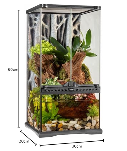 Größe in cm: 30 x 30 x 60 • Extratiefer, wasserdichter Boden 20 cm • Ideal für in Gewässern lebende Arten • Rückwand mit einzigartiger Wurzelanmutung • Zwei Türen für einen ausbruchsicheren Zugang
