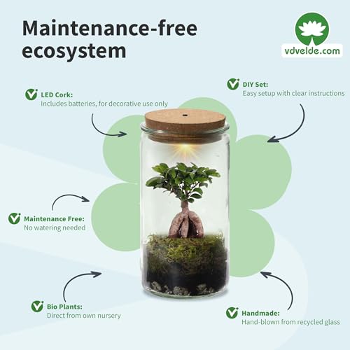 ✅ VDVELDE.COM: Seit über 35 Jahren (seit 1986) Ihre Quelle für 100% BIO-Pflanzen aus unserer Familiengärtnerei. Wir stehen für Nachhaltigkeit mit biologischem Anbau und umweltfreundlicher Verpackung. Entdecken Sie unser einzigartiges Sortiment an Pflanzen und Geschenken, die sich perfekt zum Verschenken oder Beschenken eignen. Unsere Mission ist es, Menschen mit der Natur zu verbinden, eine Pflanze nach der anderen. • ✅ FLASCHENGARTEN MIT Licht: Erstellen Sie Ihr eigenes Mini-Ökosystem mit einer wunderschönen Zimmerpflanze. Im geschlossenen Glas entsteht durch das Recycling von Feuchtigkeit und Sauerstoff ein autarkes und wartungsfreies Terrarium. Solange der Korken auf dem Glas ist, braucht die Pflanze nie wieder Wasser oder Nahrung. • ✅ HANDGEFERTIGTES GERECYCLED GLAS: Das Glas ist langlebig, recycelt und handgefertigt. Daher ist jedes Glas einzigartig und kann bestimmte Unregelmäßigkeiten/Effekte im Glas aufweisen. • ✅ EINFACHE MONTAGE: Sie können sofort mit dem Aufstellen Ihres Glases beginnen, einfach und nach Ihren eigenen Erkenntnissen. Eine einfache Anleitung ist enthalten. • ✅ KOMPLETTSET ENTHÄLT: Weck Glas inklusive Kork mit Licht, Zimmer Plantze, Substrat, 2 Kokosnusstabletten (Blumenerde), dekoratives grünes Moos und DIY Anleitung