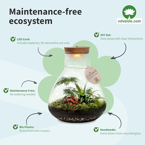 – ✅ NACHHALTIGKEIT UND QUALITÄT: Bei vdvelde.com legen wir mit unseren Ecoworld Produkten großen Wert auf Nachhaltigkeit, ohne dabei Qualitätseinbußen zu riskieren. Unsere Terrarien aus 100 % recyceltem Glas und die kompostierbaren Verpackungen demonstrieren, wie ökologisches Bewusstsein mit stilvollem und hochwertigem Wohnambiente Hand in Hand gehen kann. Die Wahl eines selbstversorgenden Ökosystems unterstützt nicht nur die Vision eines grüneren Planeten, sondern setzt auch