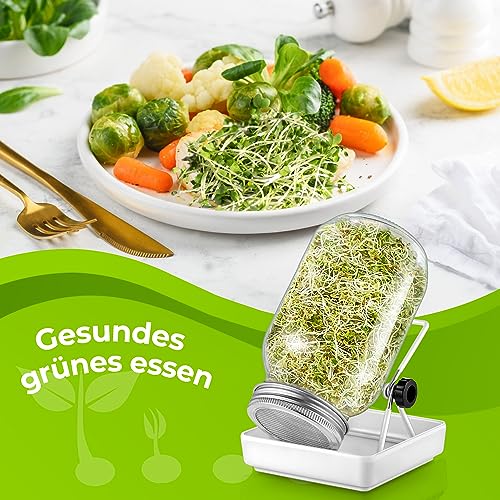 - Edelstahl-Filterdeckel verhindert Samenverlust und Fruchtfliegen; verstellbarer Ständer ermöglicht Anpassung an verschiedene Sprossen-Größen; inkl. Keimglas-Set für Indoor-Anbau.