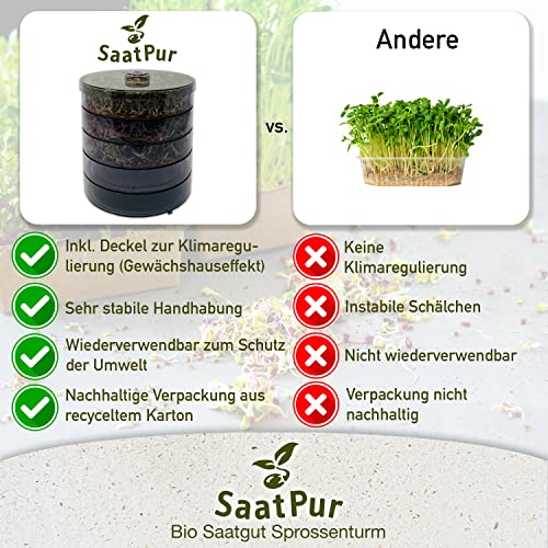 – 🌱 SET FÜR ANFÄNGER UND FORTGESCHRITTENE: Unser SaatPur Keimsprossenturm-Set besteht aus 1x Deckel, 4x Keimschale und 1x Wasserauffangschale. Auch direkt für Anfänger in der Sprossenanzucht sehr geeignet. Kostengünstig, wertvolle, vitaminreiche Ernährung die in kürzester Zeit von eigener Hand zur Verfügung steht.