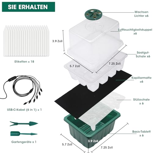 – PACKLISTE: Etiketten*20, Wachstumslichter*6, Kapillarmatte*6, Feuchtigkeitskuppel*6, Stützschale*6, Saatschale*6, Bodenschale*6, Gartengeräte*1, USB-C-Kabel (6 in 1) *1