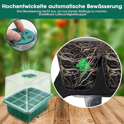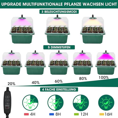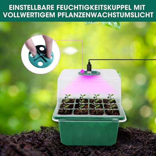 VERBESSERTE SELBSTBEWÄSSERUNG: Das selbstbewässernde Starterschalen-Set für Samen macht das Rätselraten über Bewässerungszeit und -häufigkeit überflüssig. Es minimiert Überwässerung, fördert eine gesündere Wurzelentwicklung und macht Ihre Pflanzen stärker. Für Anfänger geeignet, ein einziges Gießen reicht aus, damit die Samen zu Setzlingen keimen. • VERBESSERTES WACHSTUMSLICHT: Dieses LED-Pflanzenlicht bietet ein volles Lichtspektrum, genau wie natürliches Licht, und fördert das Wachstum von Zimmerpflanzen durch die Beschleunigung der Photosynthese erheblich. Drei Lichtmodi (Rot + Blau + Warmweiß / Rot + Blau / Warmweiß) und fünf Helligkeitsstufen (20 %/40 %/60 %/80 %/100 %) eignen sich für verschiedene Pflanzen in allen Wachstumsstadien Wachstum. Außerdem verfügt es über eine vierstufige Timer-Funktion (4 Std./8 Std./12 Std./16 Std.), sodass Sie sich keine Sorgen um das Wachstum Ihrer Pflanzen machen müssen, wenn Sie außer Haus sind. • HOCHWERTIGES PVC-MATERIAL: Die Setzlings-Starterschalen bestehen aus robustem PVC-Material, das im Vergleich zu anderen Kunststoffen dicker, ungiftig, umweltfreundlich, stark, unzerbrechlich und langlebig ist. Es kann lange wiederverwendet werden und ist umweltfreundlicher. Am Boden jedes Fachs der Saatschale befinden sich Drainagelöcher, die das Wasser ordnungsgemäß ableiten und verhindern können, dass das Wurzelsystem zu viel Wasser aufnimmt, wodurch das Wurzelsystem vor Fäulnis geschützt wird. • ERHÖHTE KUPPEL: Nach vielen Versuchen haben wir die Kuppel erhöht, um ausreichend Platz für den Anbau von Blumen, Gemüse, Früchten, Kräutern und mehr zu bieten. Diese Anzuchtschale eignet sich nicht nur zur Samenkeimung, sondern auch zur Keimung von Pflanzenstecklingen. • EINSTELLBARES FEUCHTIGKEITSDESIGN: Unsere durchsichtige Kuppel verfügt über eine einstellbare runde Lüftungsöffnung (runde Luftfeuchtigkeitslüftung und Pflanzenwachstumslicht in 2 in 1), die Innenfeuchtigkeit kann zwischen 50 und 100 % eingestellt werden. Durch Drehen des Reglers können Sie die Innenfeuchtigkeit und -temperatur ganz einfach anpassen, um sie an die verschiedenen Wachstumsstadien von Saat bis Sämling anzupassen, die Luftzirkulation zu fördern und das Saatwachstum zu unterstützen. • EFFIZIENTES WACHSEN UND BREIT ANWENDBAR: Unser Samen-Starterset hat die ideale Größe für die Anzucht kleiner Samen aus Sämlingen verschiedener Pflanzen. Geeignet für eine Vielzahl von Pflanzen. Es kann die Lichtqualität, die Lichtintensität und die Photoperiode künstlich steuern. Luftfeuchtigkeit und Temperatur, so dass sich die Pflanzen immer in der besten Wachstumsumgebung befinden, die Wachstumszeit effektiv verkürzt und der Ernteertrag und die Qualität verbessert werden. Ideales Geschenk für unerfahrene Gärtner. • PACKLISTE: Etiketten*20, Wachstumslichter*6, Kapillarmatte*6, Feuchtigkeitskuppel*6, Stützschale*6, Saatschale*6, Bodenschale*6, Gartengeräte*1, USB-C-Kabel (6 in 1) *1