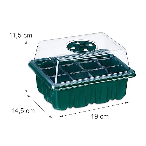 Relaxdays Anzucht Gewächshaus, 2er Set, Minigewächshaus für Fensterbank, 12 Fächer, Anzuchtbox, Deckel, grün/transparent