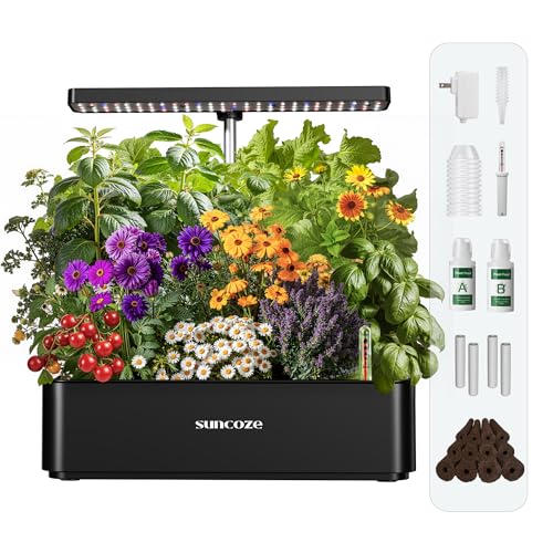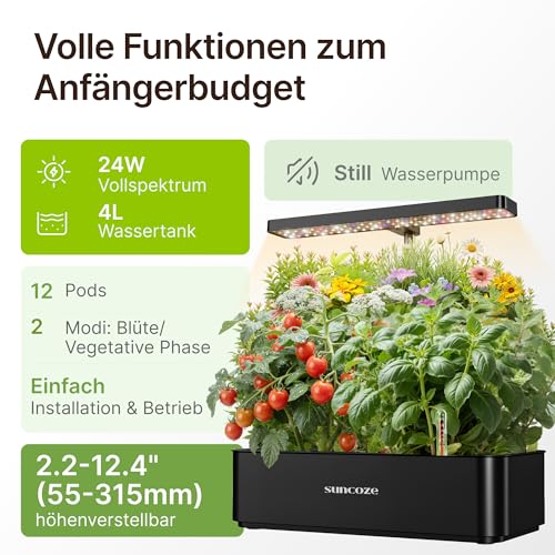 SUNCOZE Hydroponisches Anzuchtsystem, Smart Garden 12Pods, Indoor Kräutergarten Set mit LED-Wachstumsleuchte, 4L Wassertank, höhenverstellbar, leise intelligente Pumpe, für Zuhause, Küche, Schwarz