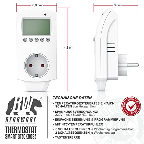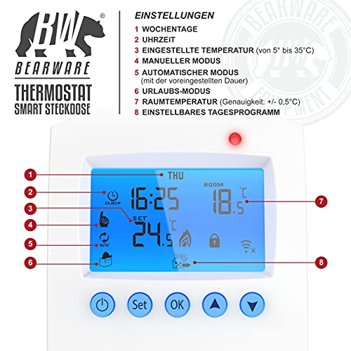 Der Bearware Steckdosen-Thermostat schaltet elektrische Heizsysteme temperaturabhängig. Z.B Infrarot-Heizungen, Heizlüfter oder auch elektrische Handtuchtrockner. Mit der kostenlosen Smart Live App, ebenso wie mit TUYA, können Sie den Steckdosenthermostat per Handy programmieren und angeschlossene Geräte ein- und ausschalten. Von überall und zu jeder Zeit. Und dank Sharefunktion können das auch Partner oder Freunde, sofern von Ihnen freigegeben. | 304968 • Stellen Sie die Zieltemperatur am Gerät ganz einfach mit den Tasten + und – ein. Der Thermostat regelt elektrische Heizungen daraufhin automatisch. Mit der Timerfunktion können Sie Ihre Smart Steckdose so programmieren, dass sich z.B. eine Infrarotheizung entsprechend der vorgegebenen Zeiten automatisch ein- und ausschaltet. | Einstellbarer Temperaturbereich (werksmäßig) von 5°-35°C. Genauigkeit der Temperaturregelung: +/- 0,5°C • Für jeden Wochentag (Mo – Fr) können Sie bis zu sechs Zeiten für frei bestimmbare Tagesabschnitte einstellen. Die im Gerät voreingestellten Werte geben bereits einen guten Ausgangspunkt für sinnvolle Einstellungen. Für das Wochenende (Sa – So) stehen zwei Schaltpunkte zur Verfügung. • Temporärer Manueller Modus: Dieser Modus umgeht für eine voreingestellte Dauer den Automatikmodus. So können Sie ohne Aufwand auf besondere Situationen reagieren. Anschließend kehrt das Gerät in den Automatikbetrieb zurück. • Regeln Sie die Temperaturwerte mit Ihrem Handy, wie Sie es möchten und genießen Sie bei der Ankunft in den eigenen vier Wänden die voreingestellte Raumtemperatur. Geeignet für Heizlüfter, Infrarot-Heizungen, elektrische Kaminheizungen usw.
