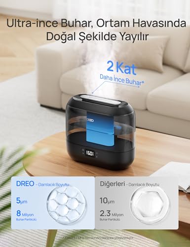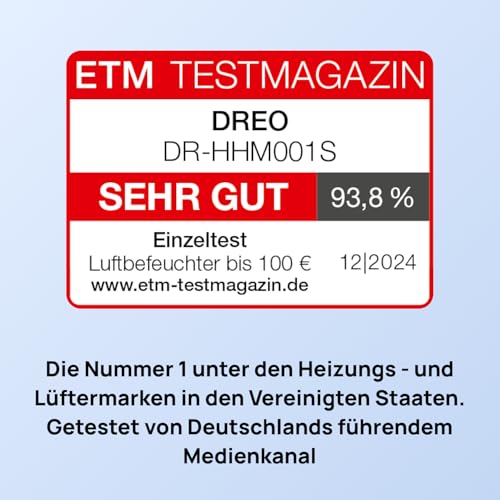 Präzise Luftfeuchtigkeit, besserer Komfort: Mit dem intelligenten Luftbefeuchter für das Schlafzimmer von Dreo können Sie endlich die Luftfeuchtigkeit zu Hause kontrollieren. Sein fortschrittlicher Algorithmus und der Auto-Modus messen die Luftfeuchtigkeit mit doppelt so hoher Präzision, während das intelligente Umgebungslicht Sie immer über Veränderungen der Luftfeuchtigkeit auf dem Laufenden hält. • Sprach- und App-Steuerung: Einfaches Anpassen von Einstellungen wie Nebelniveau, Timer und Umgebungslicht über Alexa oder Google Assistant oder von überall aus über die Dreo-App. Dieser Luftbefeuchter für Pflanzen bietet Ihnen den zusätzlichen Komfort, den Sie brauchen, wenn Sie viel zu tun haben oder weit weg von zu Hause sind. • Größerer Nebel, schnellere Linderung: Dank des Dual-Intake-Designs von Dreo erzeugt dieser Luftbefeuchter einen supergroßen Nebel, der dreimal größer ist als bei den meisten anderen Luftbefeuchtern, wodurch trockene Luft schneller gelindert wird und Sie leichter und gesünder atmen können. • Perfekte Befeuchtungslösung: Wählen Sie aus drei verschiedenen Nebelstärken und lenken Sie den Nebel mit der um 30° schwenkbaren Düse dorthin, wo Sie ihn haben möchten. Außerdem schaltet er sich automatisch ab, wenn der Tank leer ist, was ihn zum perfekten Baby-Luftbefeuchter für Kinderzimmer und Pflanzenpflege macht. • 32 Stunden ununterbrochener Komfort: Genießen Sie die ganze Nacht lang leise befeuchtete Luft, Dreos Akustikdesign senkt den Geräuschpegel auf 28 dB, während sein 4-Liter-Tank sicherstellt, dass dieser Luftbefeuchter für Babys nicht über Nacht nachgefüllt werden muss. • Einfache Reinigung, frischer Nebel: Das modulare Design dieses Luftbefeuchters gewährleistet eine einfache Reinigung. Kompatibel mit der Dreo-Entkalkungspatrone (nicht im Lieferumfang enthalten) für die Entkalkung zur Reduzierung von Kalkablagerungen und der Clean Mist Patrone für eine gesunde Luftbefeuchtung. Das ICON-Licht zeigt Ihnen an, wenn die Patrone ausgetauscht werden muss, und sorgt so das ganze Jahr über für frische Luft.