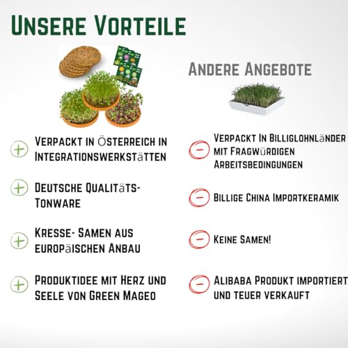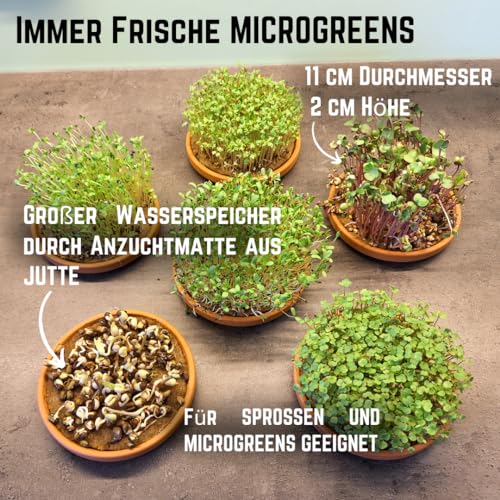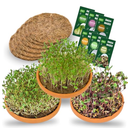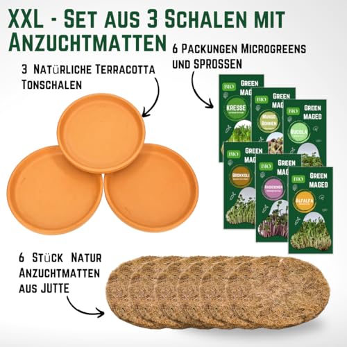 Green MaGeo Microgreens Starter Set – 3 x 11cm Microgreens Anzuchtschalen mit 6 Microgreens Samen und 3 Anzuchtmatten Jutte, ideal für die Sprossen Anzucht oder als Microgreens Anzuchtset