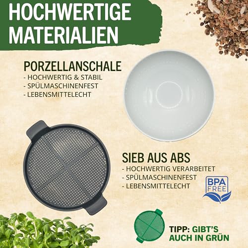 Little Plants Kresse Anzuchtschale Set + 3 x Bio Sprossen Samen Kressesieb Keimschale Kresseschale Porzellan inkl. EBook (Anthrazit)