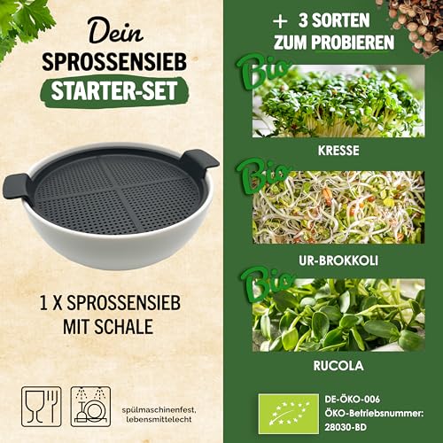 3 Bio-Sprossen-Sorten enthalten Porzellan-Keimschale mit Sprossensieb ABS-Deckel ist spülmaschinenfest und rostfrei Inklusive Sprossenpower Ebook