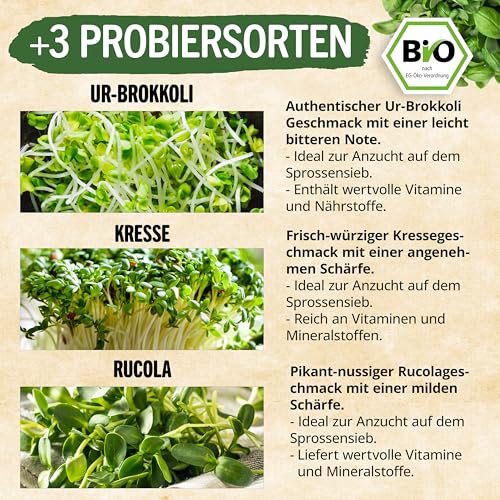 Benefits 3 Sorten Bio-Sprossen im Set, nahrhafte Microgreens mit vielfältigem Geschmack, spülmaschinenfester ABS-Deckel, rostfrei, inkl. Sprossensieb und Ebook.