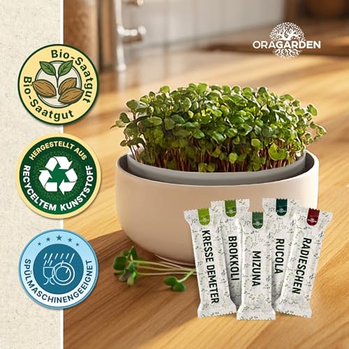 ORAGARDEN Sprossen Anzuchtset mit 5 Bio Sorten – Brokkoli, Rucola, Mizuna, Radieschen, Kresse – Microgreens Keimschale Starter Set – Anzuchtschale mit Kressesieb
