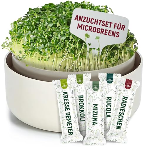 𝗦𝗽𝗿𝗼𝘀𝘀𝗲𝗻 𝗔𝗻𝘇𝘂𝗰𝗵𝘁𝘀𝗲𝘁 𝗺𝗶𝘁 𝟱 𝗕𝗶𝗼-𝗦𝗼𝗿𝘁𝗲𝗻: Dieses Microgreens kit enthält alles, was Sie für die einfache Anzucht von frischen Sprossen und Microgreens zu Hause benötigen; Im Lieferumfang enthalten sind eine nachhaltige Kunststoff-Anzuchtschale mit passendem Sieb sowie Bio-Samen der Sorten Brokkoli, Kresse, Mizuna, Radieschen und Rucola • 𝗔𝗻𝘇𝘂𝗰𝗵𝘁𝘃𝗲𝗿𝗳𝗮𝗵𝗿𝗲𝗻 𝘂𝗻𝗱 -𝗱𝗮𝘂𝗲𝗿: Mit der Sprossen Anzuchtschale können Sie in nur 3 or 5 Tagen frische Microgreens heranziehen; Der Anzuchtprozess besteht aus vier einfachen Schritten: Vorbereitung, Aussaat, Keimphase und Wachstumsphase; So genießen Sie das ganze Jahr über frisches, vitaminreiches Grün direkt aus Ihrer eigenen Küche • 𝗕𝗲𝘀𝗰𝗵𝗿𝗲𝗶𝗯𝘂𝗻𝗴 𝗱𝗲𝗿 𝗔𝗻𝘇𝘂𝗰𝗵𝘁𝘀𝗰𝗵𝗮𝗹𝗲: Die Anzuchtschale besteht aus recyceltem, cremefarbenem Kunststoff und wurde entwickelt, um einen einfachen, sauberen und umweltfreundlichen Anbau frischer Microgreens direkt zu Hause zu ermöglichen ideal für gesundes, nachhaltiges Gärtnern in der eigenen Küche • 𝗡ü𝘁𝘇𝗹𝗶𝗰𝗵𝗲 𝗘𝗶𝗴𝗲𝗻𝘀𝗰𝗵𝗮𝗳𝘁𝗲𝗻 𝘃𝗼𝗻 𝗠𝗶𝗰𝗿𝗼𝗴𝗿𝗲𝗲𝗻𝘀: Microgreens sind reich an Vitaminen, Mineralstoffen und Antioxidantien darunter Vitamin C, D und E; Sie überzeugen durch ihren frischen, würzigen Geschmack und sind eine natürliche Quelle für wertvolle Nährstoffe; Genießen Sie gesunde, selbst angebaute Microgreens als ökologisch reines und frisches Lebensmittel direkt aus Ihrer Küche • 𝗔𝗻𝘄𝗲𝗻𝗱𝘂𝗻𝗴𝘀𝗯𝗲𝗿𝗲𝗶𝗰𝗵 𝘃𝗼𝗻 𝗠𝗶𝗰𝗿𝗼𝗴𝗿𝗲𝗲𝗻𝘀: Microgreens eignen sich ideal zum rohen Verzehr beispielsweise in Salaten, auf Brot, in Säften, Smoothies, Kräuterquark oder als dekorative Zugabe zu verschiedenen Speisen; Unsere Sprossenschale ist die perfekte Wahl für alle, die frische Microgreens lieben und regelmäßig genießen möchten