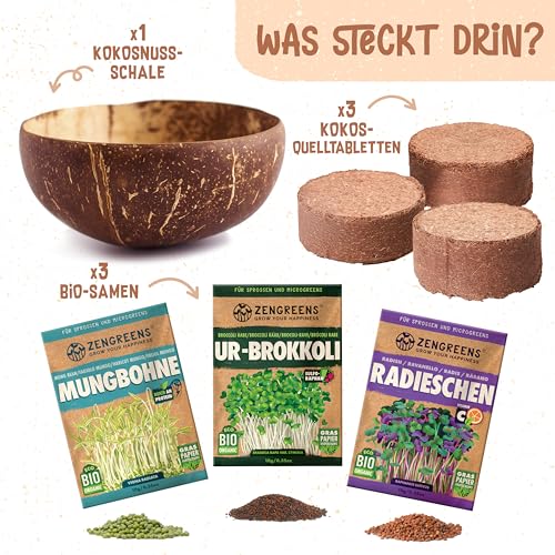 zengreens® Bio Microgreens Anzuchtset – Starter Set mit Keimschale – Enthält Kokosnuss Anzuchtschale, Kokos Quelltabletten und Sprossensamen (Brokkoli, Radieschen & Mungbohne)