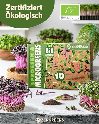 ZenGreens® – Bio Sprossensamen im 10er Set – Keimsprossensamen – für leichte Zucht im Sprossenglas oder Anzuchtschale – Probierpaket – 10 verschiedene Sorten – Microgreens Samen Mix