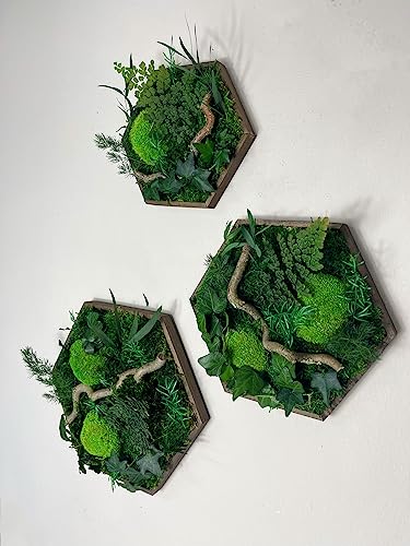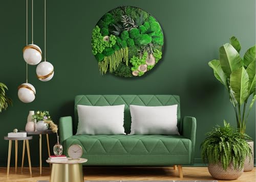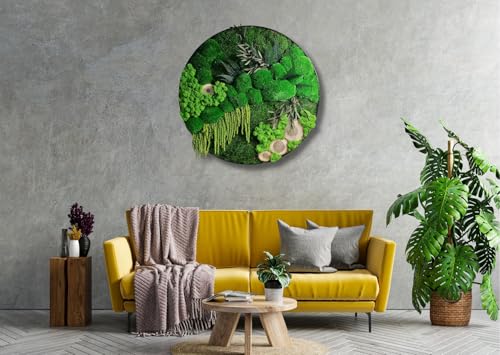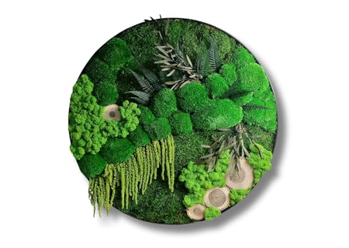 Konserviertes finnisches Moos im Rahmen Rahmengrößen 40/50/60 cm erhältlich Kugelmoos, Rentiermoos, Flachmoos, Farn, Amaranthus, Eukalyptus Walnussholz-Scheiben verleihen Struktur