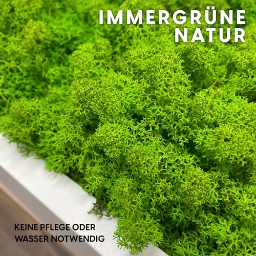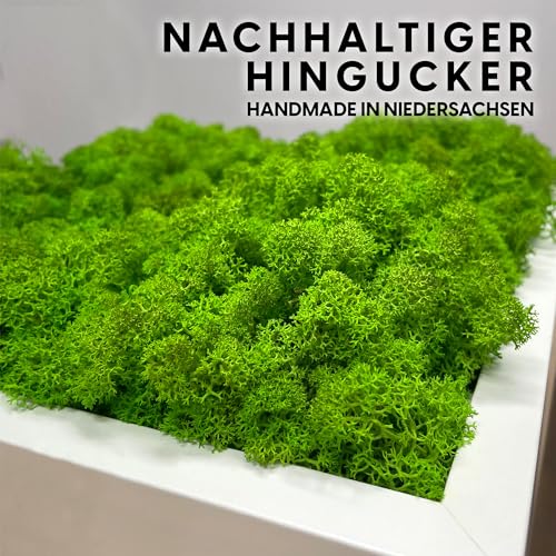 Ein einzigartiges Kunstwerk aus echtem konserviertem Moos in einem weißen, tiefen Rahmen; bestückt mit Islandmoos, sofort einsatzbereit. Das Moos wird nachhaltig angebaut, geerntet, gefärbt und konserviert. Jedes Exemplar wird in Niedersachsen von Hand im Rahmen arrangiert, wodurch es ein Unikat ist und von der Abbildung abweichen kann. Das Moos benötigt keine Bewässerung und sollte vor direkter Sonneneinstrahlung geschützt werden.
