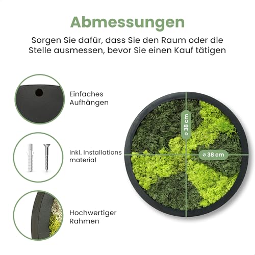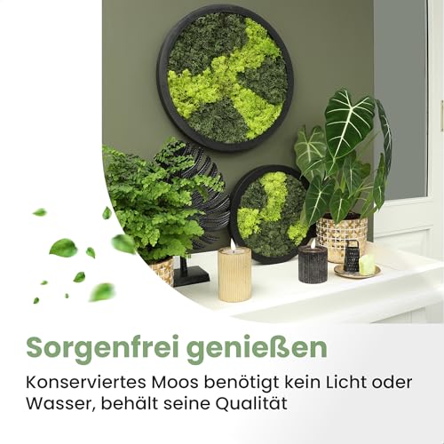 Natürliches Kunstwerk mit echtem Deko-Moos: Bring mit diesem einzigartigen Wandbild ein Stück Natur in dein Wohnzimmer oder Büro und setze ein ästhetisches Highlight mit echtem konserviertem Moos • Moos Wandbild im Rahmen: Das Moosbild im runden Rahmen mit zweifarbigen Rentier-Flechten (Cladonia Rangiferina) bestückt: Hellgrün & Moosgrün. In Matt-Schwarzem Holzrahmen (ø38 cm, 3cm tief) • 100% Natur: Die Moos Deko wird in Norwegen ressourcenschonend angepflanzt, geerntet, gereinigt, gefärbt & konserviert – alles mit Respekt zur Umwelt • Liebevolle Handarbeit: Jedes Pflanzenbild wird von Hand im Rahmen arrangiert. So wird jedes Moosbild im Rahmen zu einem Unikat & kann gering vom Produktbild abweichen • 0% Pflege: Keine Bewässerung der Moos Wandpaneele nötig. Direkte Sonneneinstrahlung vermeiden • Lang haltbares Wandbild: In einem Spezialverfahren wird das echte Moos mit ungiftigen Mitteln gefärbt & konserviert. So behält die moderne Wanddekoration ihr natürliches & frisches Aussehen, ihre Form – für langanhaltende Freude