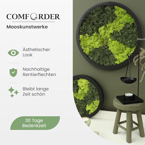 comforder Rundes Wandbild mit echtem Moos (ø38 cm), Konserviertes Moosbild mit Holzrahmen, Natur Wanddeko fürs Wohnzimmer