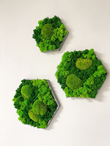 Echtes präpariertes und stabilisiertes Islandmoos und Mooshügeln. Das Islandmoos wurde zu einer Farbkombination zusammengestellt, aus unserem Moos Naturgrün und Leuchtgrün. Dies ergibt eine wunderschöne Textur, die ein absoluter Blickfang ist. • Hergestellt in Handarbeit in unserer Manufaktur in Deutschland. Fluffiges Islandmoos kombiniert mit herausstechenden Ballenmoos Blickfängern. • Verschiedene Rahmen Farben für das Sechseck, Hexagon. Viele verschiedene Rahmen Farben für das handgebaute Sechseck. Unser Hexagon zeichnet sich durch seinen dicken und stabilen Rahmen aus. • 4 verschiedene Größen erhältlich, für eine tolle Kombination, je nach welchem Bedarf. • Mit Wandmontageset und Pflegeanleitung enthalten. Der Aufhänger im Rahmen Hintergrund, macht das ausrichten des Bildes sehr einfach.