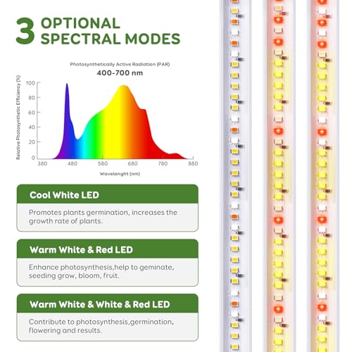 2er-Pack Grow-Lichtstreifen mit Vollspektrum-LEDs für Zimmerpflanzen. Das System umfasst insgesamt 240 LEDs: 56 LEDs 6000K Weiß, 136 LEDs 3500K Warmweiß und 48 LEDs 660 nm Rot, die ein maßgeschneidertes Vollspektrum von 380 nm bis 800 nm liefern und das Pflanzenwachstum in verschiedenen Phasen unterstützen. Mit automatischem Zyklus-Schalter und einem Speichertimer für 3/9/12 Stunden sowie drei Beleuchtungsmodi und 10 Helligkeitsstufen lässt sich das Licht flexibel an Pflanzbedürfnisse anpassen; die Aluminiumrückseite sorgt für effektive Wärmeableitung. Ideal geeignet für Zimmerpflanzen, Samen, Blumen, Hydrokultur, Sukkulenten, Gemüse, Balkone, dunkle Räume, Bonsai, Büro und Regale.