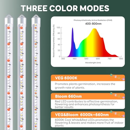 Niello 4-Stäbe Pflanzenlichtstreifen bietet Vollspektrum-Wachstumslichter mit 240 LEDs (200 weiße, 40 rote) im Wellenlängenbereich von 380 nm bis 800 nm, damit Pflanzen in allen Phasen – vom Wachstum bis zur Blüte – ausreichend Sonnenlicht erhalten. Dadurch lassen sich Erträge erhöhen und Energiekosten senken; es eignet sich auch für Samenernte. Die Leuchte verfügt über automatische Ein/Aus-Timerfunktionen mit 3 Optionen (6/12/18 Stunden) und lässt sich die Beleuchtungsdauer je nach Bedarf auf 6/12/16 Stunden einstellen. Zusätzlich gibt es 5 dimmbare Stufen, eine einfache Montage mit 8 Schrauben, 8 Klammern und 8 doppelseitigen Klebebändern sowie ein 220 cm langes Netzkabel; geeignet für verschiedene Pflanzenarten wie Blumen, Gemüse, Obst und Sukkulenten.