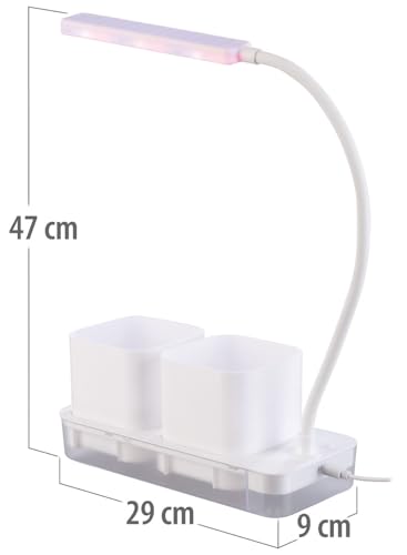Mini-Anzuchtsystem mit zwei Töpfen für Kräuter- und Innengarten • Flexibler Schwanenhals mit Wachstums-LEDs • Timer für Beleuchtungsdauer: 8, 12 und 24 Stunden • 300 ml Wassertank • Stromversorgung per USB-C • Geeignet als Kräuter- und Innengarten • Lichtfarbe: rosa • Leistungsaufnahme: 2,5 Watt • Flexibler Schwanenhals mit Wachstums-LEDs • 300 ml Wassertank • Stromversorgung: USB-C (Netzteil bitte dazu bestellen) • Timer für Beleuchtungsdauer: 8, 12 und 24 Stunden • Spritzwassergeschützt: IP44, auch für den geschützten Außenbereich • Maße: 47 x 29 x 9 cm, Gewicht: 230 g • Mini-Anzuchtsystem inklusive 2 Pflanz-Töpfen, USB-Anschlusskabel (USB-A auf USB-C) und deutscher Anleitung. Aufzuchtstation – Außerdem relevant oder passend zu: LED Beleuchtung, Wasserspender, Pflanzen, Wachstum, Bewässerung, Blumentopf, Grow Lampe, Aufzucht, Frühbeet, Gewürz, Balkon, Samen, Zucht, Topf