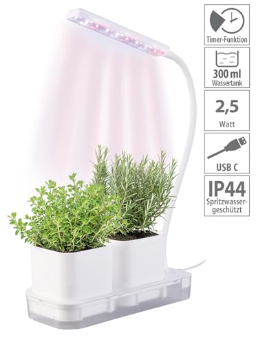 | Benefits | 2 Töpfe, flexibler Schwanenhals, Timer (8/12/24 h), 300 ml Wassertank, USB-C, IP44-Schutz, kompakt und benutzerfreundlich. |