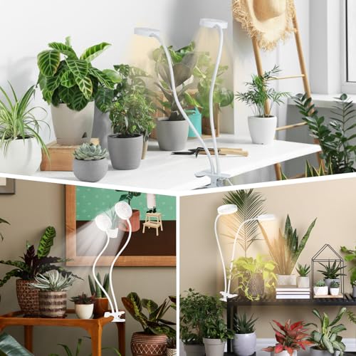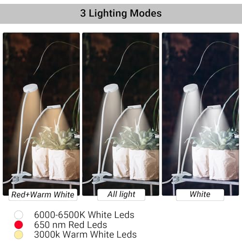 Pflanzenlampe: Dieser Pflanzenlampe besteht aus zwei flexiblen Lampenköpfen mit einer Kombination aus roten, warmweißen und weißen LEDs. Es bietet drei verschiedene Lichtmodi (rot + warmweiß + weiß, rot + warmweiß, weiß), die sich an verschiedene Pflanzenbedürfnisse anpassen lassen und eine optimale Wachstumsumgebung für Ihre Pflanzen schaffen. • 10 Lichtstärken: Mit 10 einstellbaren Helligkeitsstufen können Sie das Pflanzenlicht nach den Bedürfnisse Ihrer Pflanzen einstellen. Dieser Grow Lampe bietet Ihnen die Flexibilität, das ideale Lichtniveau für Ihrer Planzen einzustellen. • Praktische Timer-Funktion: Die Timer-Funktion bietet drei Zeitoptionen: 4 Stunden, 8 Stunden und 12 Stunden, und ermöglicht es, das Pflanzenlicht automatisch ein- und auszuschalten. Sie müssen das Licht nicht mehr täglich manuell einstellen – die Zeitschaltuhr erledigt es für Sie. Bitte beachten Sie, dass nach einem Stromausfall der Timer neu eingestellt werden muss. • Zwei Beleuchtungsmodi: Das Licht unterstützt sowohl den Einzel- als auch den Dual-Head-Modus. Drücken Sie einmal den Ein-/Ausschalter für den Doppelmodus (beide Lampenköpfe leuchten), ein weiteres Drücken schaltet in den Einzelmodus (nur ein Lampenkopf leuchtet). Im Einzelmodus können Sie weiterhin Helligkeit, Timer und Lichtfarbe anpassen. • Flexibles Design: Das Pflanzenlicht ist mit einem flexiblen, verstellbaren Schwanenhals ausgestattet, sodass Sie die Position und den Winkel der Pflanzenlampe nach Bedarf anpassen können. Dank des Klemmdesign lässt sich das Licht an verschiedenen Orten anbringen, was es ideal für den Einsatz auf Tischen, Regalen und mehr macht.