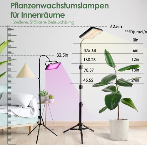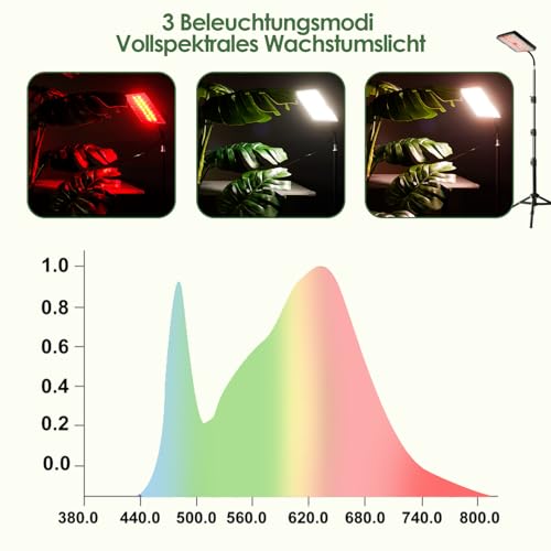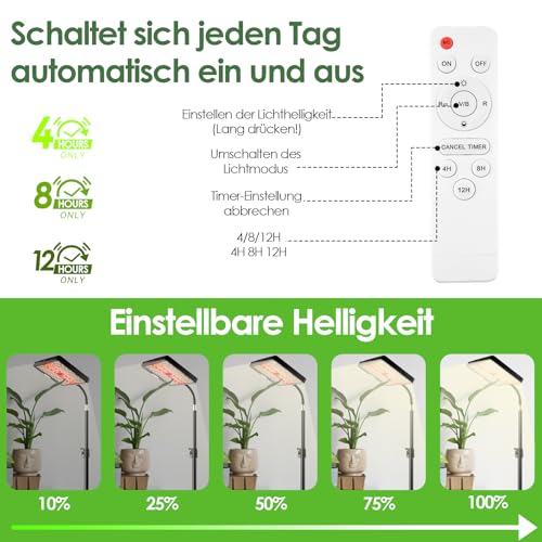[226 Led Pflanzenlampe Vollspektrum]: Unser lampe pflanzen anzucht mit hochwertigen super hellen LEDs, bieten volle Spektrum 380nm-800nm, einschließlich weiß 5000K/102 LEDS, warmweiß 3000K/102 LEDS, rot/14 LEDS, UV-IR/8 LEDS, um effektiv zu fördern Indoor-Pflanzenwachstum jeder Zeit des Jahres, vorteilhaft für die gesamte Wachstumsperiode. • [Innovative Fernbedienungsfunktion]: Für eine benutzerfreundliche Bedienung sind unsere pflanzenlampe stehend mit einer Fernbedienung ausgestattet. Keine Notwendigkeit, manuell einzustellen, tippen Sie einfach auf die Taste, können Sie leicht den Lichtschalter, Helligkeitseinstellung steuern und Lichtmodi wechseln, so dass Pflanzenwachstum Management bequemer und effizienter. • [Helligkeit Einstellbar Und Drei Beleuchtungsmodi]: Unsere Pflanzenlampe bietet drei verschiedene Beleuchtungsmodi (Rotlicht, Tageslicht und Mischlicht). Sie können auch die Helligkeit der LED-Leuchten nach Bedarf anpassen, um den verschiedenen Wachstumsphasen der Pflanzen gerecht zu werden (Die Helligkeit kann ganz einfach durch langes Drücken der Taste auf der Fernbedienung eingestellt werden!). • [Einfache Installation Und Vielseitigkeit]: Unsere LED Pflanzenlampen ist mit einem flexiblen Schwanenhals und einem verstellbaren Ständer ausgestattet. Die Installation ist einfach, und die Höhe sowie der Winkel können frei eingestellt werden, um sich an verschiedene Pflanzentypen anzupassen. Ob es Sämlinge, Sukkulenten oder Topfpflanzen sind, können Sie den besten Lichteffekt zu erhalten. • [Energiesparende Pflanzen Lampe]: Mit nur 25W Leistung liefert diese 220V-Lampe beeindruckende 3700 Lumen, wodurch Ihre Pflanzen optimal gedeihen können. Sie spart Strom und senkt Kosten, ohne an Helligkeit oder Wirkung einzubüßen – ideal für nachhaltige Indoor-Gärten. • Achtung: 1. Zwei der LEDs sind Ferninfrarot-LEDs, die eine geringere Helligkeit aufweisen, da sie Infrarotlicht abgeben, das für das menschliche Auge unsichtbar ist. Diese LEDs sind speziell für das Pflanzenwachstum entwickelt und sind kein Defekt, sondern Teil des normalen Designs des Produkts. 2. Der Signalempfänger der Pflanzenlampe befindet sich in der Mitte des Lampenkopfes. Für eine optimale Nutzung der Fernbedienung sollte diese direkt oder seitlich auf die Pflanzenlampe gerichtet werden. Eine Bedienung von hinten führt zu eingeschränkter Funktionalität.