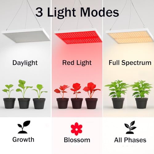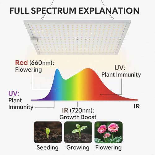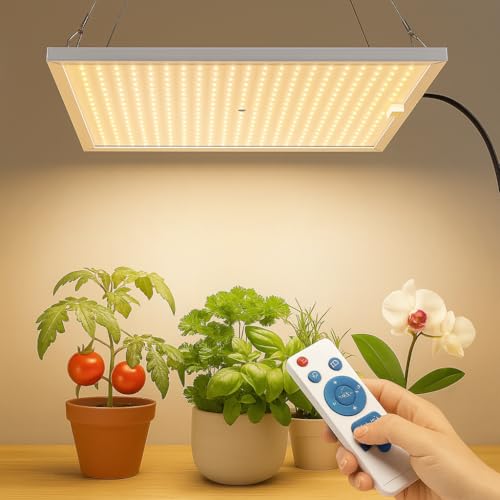 🌿 Leistungsstarke 100W Grow Lampe mit 14500 Lumen Mit 540 hochwertigen LEDs bietet die Pflanzenlampe eine starke Lichtausbeute und gleichmäßige Ausleuchtung für alle Wachstumsphasen – ideal für Anzucht, Blüte und Indoor-Garten. • 🌞 Full Spectrum mit IR & UV – 3 Lichtmodi wählbar Enthält weißes, warmweißes, rotes, UV- und infrarotes Licht (720nm) für maximales Pflanzenwachstum. Wählen Sie zwischen Tageslicht-, Rotlicht- oder Vollspektrum-Modus je nach Bedarf. • 📏 Hoher PPFD-Wert für effektive Photosynthese Mit einem PPFD-Wert von 650 µmol/m²/s bei 30 cm Abstand liefert diese 100W Pflanzenlampe intensive Lichtenergie für anspruchsvolle Pflanzen, Blütephasen und dichte Begrünung – perfekt für mittelgroße Indoor-Gärten und Anzuchtbereiche. • 🎛️ Dimmbar & Fernbedienung – einfache Steuerung Stufenlose Helligkeit von 10% bis 100% – bequem per Fernbedienung einstellbar. Ideal zur Anpassung an verschiedene Pflanzenarten und Wachstumsphasen. • ⏱️ Praktischer Timer: 4H / 8H / 12H Automatische Beleuchtung dank integriertem Timer – spart Energie und sorgt für einen natürlichen Tag-Nacht-Rhythmus. Kein manuelles Ein- und Ausschalten mehr nötig.