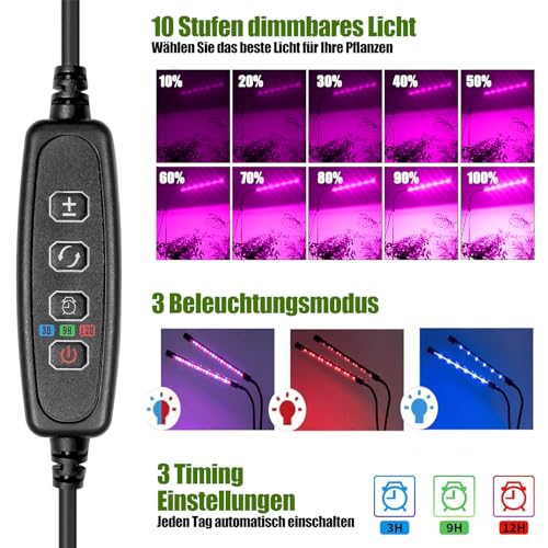 【2*40 LED Pflanzenlampe】Diese Pflanzenleuchte LED verwendet hocheffiziente Lichtquelle mit 80 LED-Perlen an jeder Pflanzenleuchte und höherer Lumenleistung. Jede Leuchte ist geeignet für 3-5 kleine Pflanzen.Es emittiert alle Wellenlängen von 460nm bis 660nm, ideal für alle Wachstumsstadien und verschiedene Pflanzen wie Sukkulenten, Orchideen, Kräuter, Tomaten, etc.Helfen Sie Ihren Pflanzen besser zu wachsen! • 【10 Lichtstärken Dimmable】 Unsere Vollspektrum Pflanzenlampe, die Diodenanordnung in einem Kreis gesammelt, so dass die Pflanzen das Licht besser absorbieren, und wachsen glücklicher. 10 Helligkeitsstufen von 10% bis 100% wählen, die den Mangel an natürlichem Sonnenlicht effektiv ergänzen und das Wachstum der Pflanzen in allen Phasen fördern, besonders geeignet für die Aussaatphase der Pflanzen. • 【3/9/12H Timer】Die Wachstumslampe für Pflanzen für Zimmerpflanzen hat 3/9/12 Stunden Timing-Funktion. Bei einer Einstellung von 3 Stunden Leuchtdauer leuchtet die“ blaue“ Kontrollleuchte; Wenn Sie eine Beleuchtungsdauer von 9 Stunden einstellen, leuchtet die grüne Kontrollleuchte auf; Wenn Sie 12 Stunden Beleuchtungszeit einstellen, leuchtet die „rote“ Kontrollleuchte; Um den Timer-Modus zu beenden, sind alle Anzeigen aus. (Nach der Einstellung der Zeit, wird dieses Licht wachsen automatisch am nächsten Tag einschalten, keine Notwendigkeit, manuell einschalten). • 【3 Beleuchtungsmodi】Das Pflanzenwachstumslicht verfügt über 3 Beleuchtungsmodi (Rot, Blau,Rot+Blau), die dem natürlichen Licht unendlich nahe kommen und die wachsenden Bedürfnisse von Pflanzen von der Aussaat bis zur Reife erfüllen. • 【IP44-Pflanzenleuchte】Diese Pflanzenleuchte ist wasserdicht nach IP44. usb-Anschluss, z. B. für Computer, Akkus, Adapter usw. 220 V (kann an eine Reihe von Spannungen von 110 bis 240 V angeschlossen werden). lange Lebensdauer (> 50.000 Stunden).Diese pflanzenleuchte verfügt über einen 360° flexiblen Schwanenhals aus Edelstahl, mit dem die Beleuchtungsfläche erweitert und der Winkelabstand zwischen Licht und Pflanzen leicht eingestellt werden kann.