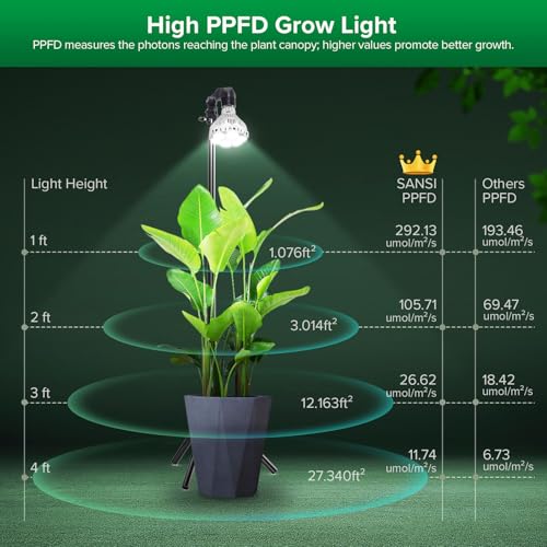 – HOHE WACHSTUMSLEISTUNG: Unsere SANSI Pflanzenlampe nutzt die sekundäre optische Linse mit 60° Abstrahlwinkel, die die Gleichmäßigkeit des Lichts verbessert und den Lichtverlust vermeidet. Die hohe PPFD beträgt 345 μmol/s/㎡@1ft, helfen Ihre Pflanzen gesünder und schneller zu wachsen.