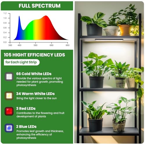 – Vollspektrum-Pflanzenlicht: Jede Lichtleiste ist mit 6000K Kaltweiß-LEDs, 3500K Warmweiß-LEDs, 660nm Rot-LEDs und 450nm Blau-LEDs ausgestattet. Sie bietet echtes Vollspektrum-Licht mit Wellenlängen von 380nm bis 800nm, unterstützt die Photosynthese und deckt den gesamten Wachstumsbedarf verschiedener Zimmerpflanzen in allen Entwicklungsphasen ab.