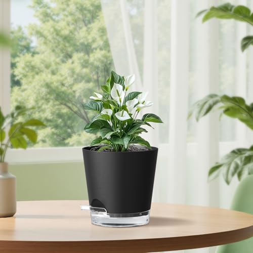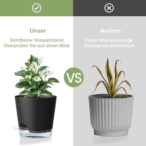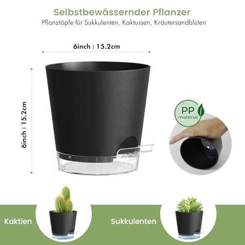 【Vielseitig einsetzbares Pflanzgefäß-Set】 Dieses 3er Set selbstbewässernder Blumentöpfe (15,2 x 15,2 x 20,3 cm) eignet sich mit einem empfohlenen Erdvolumen von 1,8 L pro Topf ideal als Kräutertopf in der Küche für Basilikum und Minze oder als Übertopf für Zimmerpflanzen wie Efeutute oder Grünlilie. Ein zuverlässiger Helfer für alle, die stilvoll und unkompliziert gärtnern möchten. • 【Intelligentes Bewässerungssystem für Balkon & Innenbereich】 Der Blumentopf mit Bewässerungssystem nutzt ein Baumwoll-Docht, das Wasser gleichmäßig aus dem unteren Reservoir zur Pflanzenwurzel leitet – ganz wie in der Natur. Die doppelte Struktur trennt den Topf vom Wasser, verhindert Staunässe und schützt zuverlässig vor Wurzelfäule. Der transparente Untersetzer zeigt den Wasserstand deutlich – Nachfüllen nur alle 7–10 Tage nötig. • 【Hochwertiges Design in moderner Ästhetik】 Gefertigt aus robustem Polypropylen (PP) überzeugt der Blumentopf schwarz durch seine matte Oberfläche mit angenehmer Haptik und einem transparenten Untersetzer, der Funktionalität mit Stil verbindet. Das Material ist hitze- und frostbeständig, ideal als Kräutertopf in der Küche oder als stilvolle Ergänzung im Wohnzimmer. Pflegeleicht, langlebig und ästhetisch – für moderne Wohnkonzepte gemacht. • 【Für jeden Pflanzenfreund geeignet – vom Anfänger bis zum Profi】 Ob berufstätige Pendler, Familien mit Kindern oder Senioren – dieser selbstbewässernde Blumentopf reduziert den Pflegeaufwand, ohne auf gesundes Wachstum zu verzichten. Der Blumentopf mit Untersetzer ist einfach zu handhaben, dekorativ im Design und perfekt für alle, die natürliche Akzente im Alltag schätzen. Pflanzenpflege wird damit zur Freude, nicht zur Pflicht. • 【Vielseitig einsetzbar für jede Umgebung】 Dieser Blumentopf mit Bewässerungssystem eignet sich ideal für Küche, Wohnzimmer, Schlafzimmer sowie Balkon oder Terrasse (bitte nicht dauerhaft der Sonne oder Frost aussetzen). Als Geschenk zum Umzug oder zu Feiertagen ist das 6er Set Blumentopf selbstbewässernd ebenso praktisch wie charmant. Perfekt auch für Cafés, Büros oder als kleine Aufmerksamkeit für Pflanzenliebhaber.