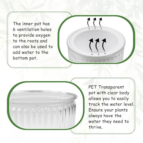 – 【Wissenschaftliche Entwässerung und Wasserspeicherung, doppelte Pflege für Pflanzen】Die einzigartige Doppelschichtstruktur besteht aus einem weißen Innenblumentopf mit zahlreichen Drainagelöchern am Boden, die ein Überfeuchten und Verfaulen der Wurzeln verhindern, und einem transparenten Außenblumentopf, der Wasser für eine Woche speichern kann und über eine Baumwollschnur automatisch mit Wasser versorgt wird. Der weiße Blumentopfdeckel verfügt über Belüftungslöcher, die sowohl der Wasserversorgung als auch der Sauerstoffzufuhr dienen. So wird den Pflanzen sowohl bei der täglichen Pflege als auch bei kurzen Abwesenheiten eine stabil feuchte Umgebung geboten