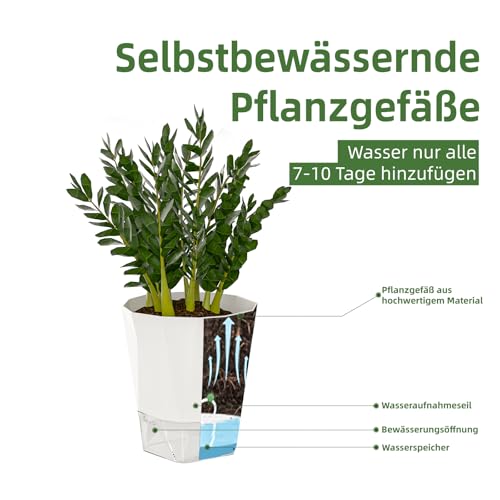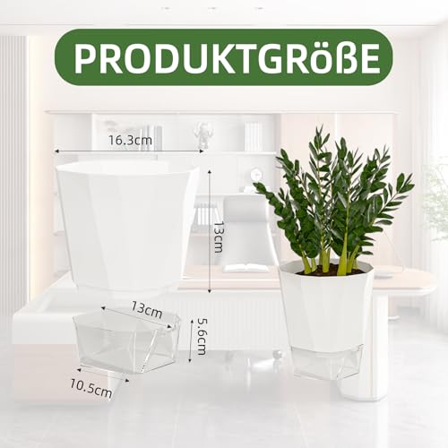 Automatisches Bewässerungsdesign: Jeder Blumentopf ist mit einem automatischen Bewässerungsseil ausgestattet, das kontinuierlich Wasser aus dem unteren Wasserspeicher in die Erde leitet, um sicherzustellen, dass die Pflanzen jederzeit ausreichend mit Wasser versorgt werden und die Häufigkeit der Bewässerung verringert wird. • Transparente Wasserspeicherbasis: Der Boden besteht aus einem transparenten weißen Kunststoff-Wasserspeicher, der es ermöglicht, den Wasserstand jederzeit zu überwachen, ohne sich Sorgen um Wassermangel oder Überwässerung der Pflanzen machen zu müssen, was das gesunde Wachstum der Pflanzen fördert. • Langlebiges Material: Die Blumentöpfe bestehen aus hochwertigem Kunststoff, der leicht und robust ist. Sie sind sowohl für den Einsatz im Freien als auch zur Innendekoration geeignet und lassen sich leicht reinigen und pflegen. • Vielseitiges Design: Das klassische, schlichte Design eignet sich für die Bepflanzung verschiedener Pflanzenarten, insbesondere für mittelgroße bis kleine Zimmerpflanzen wie Sukkulenten, Kakteen und Kräuter. • Größe: Dieses Set enthält vier Kräutertöpfe. Jeder Topf hat eine Tiefe von 13,5 cm, einen Durchmesser der Blumentopföffnung von 17 cm und eine Gesamthöhe von 18 cm. Der Bodendurchmesser beträgt 10,5 cm, was eine optimale Größe für Ihre Küchenkräuter bietet.
