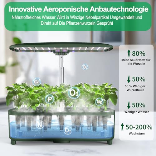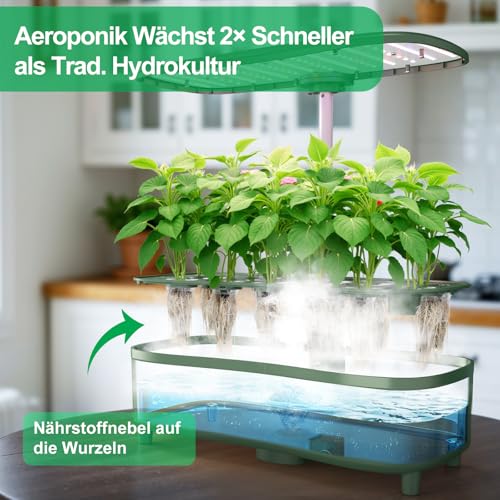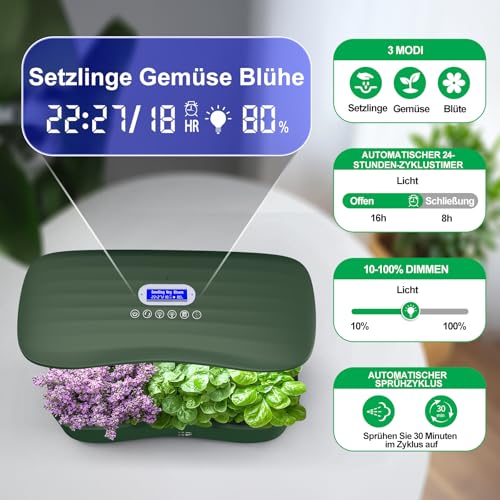 Innovative Vernebelungstechnologie: Erhöht den Sauerstoffgehalt im Wasser um 80 %, verbessert die Nährstoffaufnahme um 50 % und beschleunigt das Pflanzenwachstum bis zu 5-mal schneller als herkömmlicher Bodenanbau. Das hydroponische Anzuchtsystem mit Wasserzirkulation (30 Min. Vernebelung + 30 Min. Pause) sorgt für eine gleichmäßige Bewässerung und geräuscharmen Betrieb. • Vollspektrum-LED-Beleuchtung: Drei Lichtmodi – Keimung, Wachstumsphase und Blüte – bieten optimale Beleuchtung für jede Phase. Die LED-Lampe des hydroponischen Anzuchtsystems ist von 41 bis 53 cm höhenverstellbar und passt sich verschiedenen Pflanzenbedürfnissen an. • 15 Pflanzenplätze & Großer Wassertank: Im Vergleich zu Modellen mit 8 oder 12 Plätzen verfügt dieses hydroponische Kräuterbeet über 15 Anzuchtplätze, ideal für Kräuter, Gemüse und Blumen. Der 5-Liter-Tank sorgt für eine Wasserversorgung von 2-3 Wochen – perfekt für vielbeschäftigte Menschen und Reisende. • Intelligente Temperaturregelung & Timer-Funktion: Das Smart Garden hydroponisches Anzuchtsystem passt die Wassertemperatur automatisch um 2-4°C an, um auch im Winter optimale Wachstumsbedingungen zu gewährleisten. Der integrierte Timer ermöglicht eine automatische tägliche Steuerung ohne manuellen Aufwand. • Indoor-Garten & Kreatives Geschenk: Perfekt für die Küche oder als Wohnaccessoire – dieses hydroponische Anzuchtsystem ermöglicht jederzeit frische Kräuter. Ein großartiges Geschenk für Gartenliebhaber und Fans der hydroponischen Pflanzenzucht.