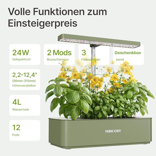 SUNCOZE Hydroponisches Anzuchtsystem, Indoor Kräutergarten Set mit LED-Wachstumsleuchte, Smart Garden 12Pods, höhenverstellbar, 4L Wassertank, leise intelligente Pumpe, für Zuhause, Küche, Grün