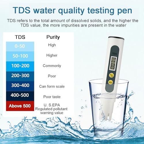 | Messbereich | – 0 – 9990 ppm (Teile pro Millionen). • | Messen Sie zuverlässig TDS | – Ausgestattet mit einer hochwertigen Sonde aus Titanlegierung ermöglicht der TDS-Wasserqualitätstester einen schnellen und bequemen Test. • | Breite Verwendung | – Ideal für Trinkwassertest, Schwimmbad, Labor, Pflanzen, Aquarium, Brunnenwasser usw. • | Testen Sie Ihr Wasser | – Wie rein ist Ihr Wasser? Nutzen Sie das TDS Messgerät, um Schlussfolgerungen zu ziehen. • | LCD Bildschirm | – Mit der numerischen LCD-Anzeige können Sie die Veränderungen der Wasserqualität klarer erkennen und die Sorgen im Leben lindern.