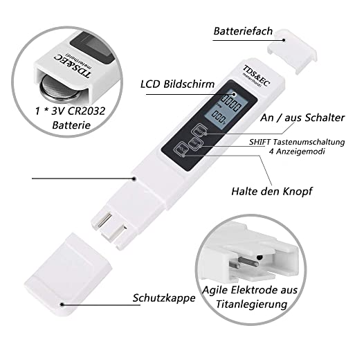 3 in 1 Design: Wasserqualitätstester Besteht aus TDS Meter, EC-Meter und Temperaturmesser. Sie können den Mini Wasserqualitätsstift verwenden, um Wasser zu testen, das zum Trinken, Hydroponik oder zum Füllen Ihres Aquariums verwendet wird. • Messbereich: Leitfähigkeit: 0-9990 us / cm, TDS: 0-9999 ppm, Celsius: 0,1-80,0 ℃, Fahrenheit: 32,0—176,0 ℉, Genauigkeit: ± 2%, Größe: 154 × 30 × 14 mm, Nettogewicht: 55 g. • Multimodusumwandlung: Sie können zwischen TDS und Leitfähigkeit wechseln, indem Sie auf die Schaltfläche SHIFT klicken. Halten Sie die SHIFT Taste zweimal gedrückt, um zwischen Celsius und Fahrenheit zu wechseln. • Auto-Off- und Hold-Funktion: Der TDS-Tester schaltet sich nach 10 Minuten Nichtbenutzung automatisch aus, um die Batterien zu schonen. verfügt über eine Hold-Funktion, die Messungen zum bequemen Lesen und Aufzeichnen speichert. • Weit verbreitet: Es ist ein Muss für jeden Haushalt, wenn es um das Prüfen von Leitungswasser, gefiltertem Wasser, destilliertem Wasser, Wasser in Flaschen, Brunnenwasser, gekühltem Wasser usw. geht. Hydroponik, Pool & Spa, kolloidales Silber, Wasseraufbereitung und mehr.