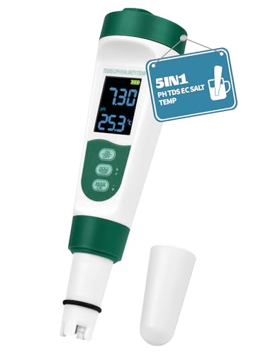 Multifunktionales ph messgerät wasser: Das tds messgerät für trinkwasser kann eine Vielzahl von Messungen durchführen. Mit pH-, EC-, TDS-, Salzgehalt und Temperaturmessung Fähigkeiten, Die Hintergrundbeleuchtung sorgt dafür, dass Sie das Produkt in schwach beleuchteten Arbeitsumgebungen verwenden können • Einfache bedienung und leicht zu nutzen: Schalten Sie das PH-Messgerät ein, Drücken Sie einfach die (MODE/CAL)-Taste, um zwischen pH, Salzgehalt, EC und TDS zu wechseln und Werte abzulesen. Halten Sie die Taste HOLD/TEMP lange gedrückt, um zwischen den Einheiten Temperatur und Celsius zu wechseln • Hochpräzises 5-in-1 ph wert messgerät pool: Das ph ec messgerät verfügt über eine neue, verbesserte Sensorsonde und eine hochentwickelte Elektrode mit extrem niedriger Impedanz für eine schnelle Reaktion, um präzise und stabile Messwerte sicherzustellen • Das tragbare ec messgerät ist weit verbreitet: stabile Leistung, geeignet für Haushaltswasser, Trinkwasser, Umkehrosmosesysteme, Hydrokulturen, Aquarien, Schwimmbäder, Whirlpools, Spas usw. um eine Vielzahl von Wasserqualität Tests Anforderungen zu erfüllen • Unterstützt eine Autokalibrierung: kann leicht eine automatische Kalibrierung bei 4,01, 6,86, 9,18 durchführen – gemäß der Bedienungsanleitung und mit dem mitgelieferten Kalibrierkit. Das Gerät ist werkseitig kalibriert und sofort einsatzbereit. Bei Fragen wenden Sie sich gerne an unseren Kundenservice