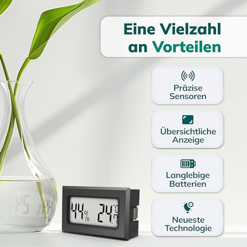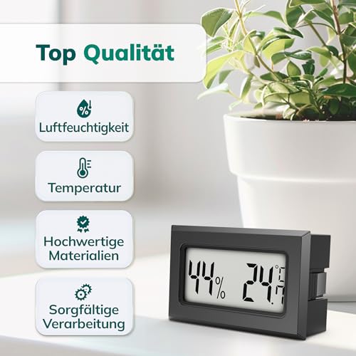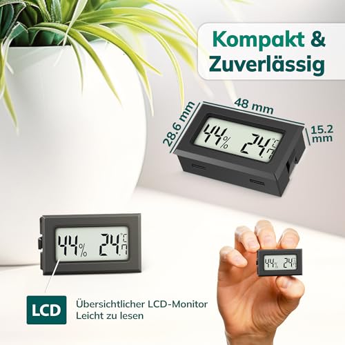 ZUVERLÄSSIG & GENAU – Hydrometer und Raumthermometer mit verlässlichen Messwerten zur Kontrolle der Luftfeuchtigkeit (20% ~ 99% RH bei +/- 5% Toleranz) und Temperatur (-20 ~ +60 ℃ bei +/- 1 ℃ Toleranz) im Innenbereich! • MODERNSTE MESSTECHNIK – Unsere Geräte verfügen über eine sehr präzise Messtechnik, so dass Sie sich zu 100% auf den Mini Hygro Thermometer verlassen können. • SOFORT EINSATZBEREIT – Das Termometer und Hydrometer Feuchtigkeit digital ist werksseitig bereits mit Knopfzellen-Batterien (1,5V LR44) bestückt und sofort einsatzbereit. • ÜBERSICHTLICH – Die Luftfeuchtigkeit und Temperatur sind trotz des kompakten Designs leicht auf dem Display abzulesen. Die relative Luftfeuchtigkeit wird in RH%, die Temperaturanzeige in ℃ angezeigt! • VIELSEITIG – Dieser Hygro-Thermometer verfügt seitlich über 2 Spangen. Somit ist das Thermometer und Feuchtigkeitsmessgerät nicht nur zum Aufstellen geeignet, sondern kann auch als Einbaugerät genutzt werden!