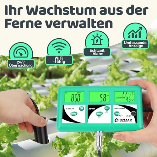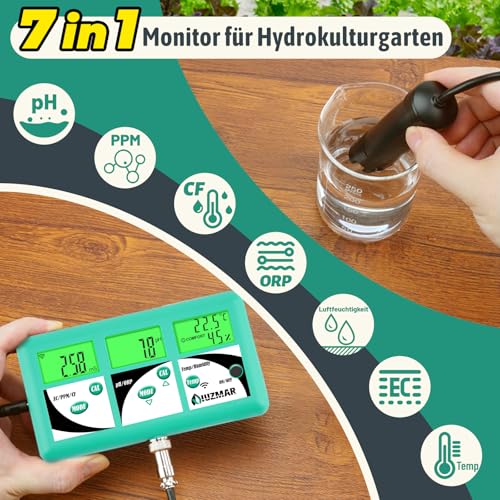 UIUZMAR pH EC TDS Messgerät für Hydrokultur, 7 in 1 pH EC PPM 500 PPM 700 CF Temperatur Luftfeuchte Monitor für Aeroponik, Kontrolle des Leitfähigkeits pH Werts der Hydrokultur Nährlösung