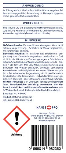 – ✓ HÄLT VERDUNSTUNGSWASSER FRISCH & HYGIENISCH: Das im Set enthaltene Hansepro Hygiene-Mittel sorgt dafür, dass Verdunstungs-Wasser hygienisch einwandfrei bleibt. Es vermeidet Bakterien- und Keimbildung. Das Algenwachstum wird verhindert. Dadurch kommt es zu keinen unangenehmen Gerüchen. Die Kalkablagerungen im Gerät werden deutlich reduziert. Die Verdunstleistung kann um bis zu 35% erhöht werden.