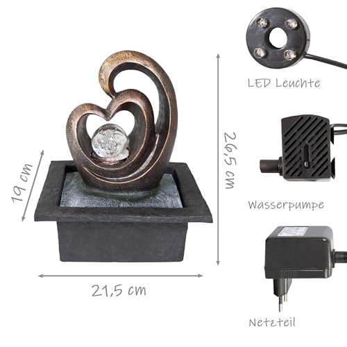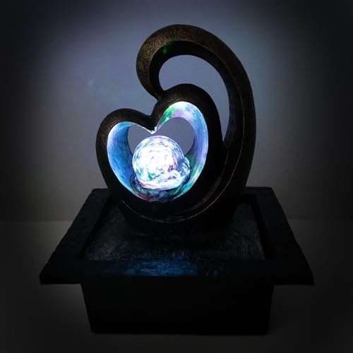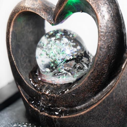 Lemodo Zimmerbrunnen LED mit rotierender Glaskugel, Indoor Brunnen Feng Shui Tischbrunnen, leiser Wasserbrunnen Deko Herzform, Wohnzimmer Büro Meditation entspannend Raumbrunnen 21,5x19x26,5 cm