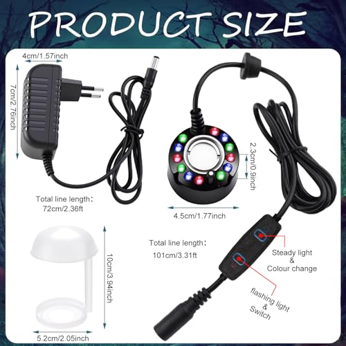 Spritzschutz:Der Mist Maker Fogger produziert eine kleine Menge Wasser, wenn er Nebel erzeugt, daher ist er mit einer wasserdichten Abdeckung ausgestattet, um Wasserspritzer zu reduzieren und unnötigen Ärger zu vermeiden. • Weit verbreitet:Maschine kann dichten Nebel für Ihren Innenbrunnen oder Wasserspiel in Sekunden erzeugen, es ist 100% Wassernebel, geruchlos und farblos. Zerstäuber kann eine große Menge Nebel zu Ihrem Kessel oder Rockery hinzufügen, es wird eine magische und bessere Atmosphäre schaffen. • Einfach und sicher zu bedienen:Platzieren Sie Ihren Nebelmacher Nebelmacher in Wasser horizontal und schließen Sie die Energie an, dann Nebel herauskommen, erhalten Sie den besten Effekt, wenn die Wasserlinie 2-3cm (1inch) höher als die Oberseite der Nebelmaschine ist. Bitte verwenden Sie auch sauberes Wasser, und die Befeuchter Nebel Nebel verbrauchen Wasser mit einer Geschwindigkeit von 400ml/H. und der Zerstäuber ist mit Isolierbeschichtung bedeckt. Achten Sie darauf, den Luftbefeuchter nich • Kleine Größe:Der Teil des Drahtes in der Nähe des Nebelmachers ist dicker, und egal, wie viel es gebogen ist, Sie können nicht dafür sorgen, dass es keinen Platz einnimmt. So benötigen Sie einen Raum von mindestens 5cm (2inch) in Länge, Breite und Höhe, um die Nebelmaschine zu platzieren. • Attraktive 12 LED Leuchten:Strahlende und farbenfrohe Beleuchtung, Ausgestattet mit mehrfarbiger Beleuchtung, die je nach Bedarf angepasst werden kann, erzeugt der Wassernebel einen verträumten und romantischen visuellen Effekt.
