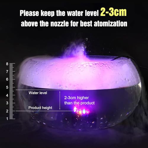 – Einfach und sicher zu bedienen:Platzieren Sie Ihren Nebelmacher Nebelmacher in Wasser horizontal und schließen Sie die Energie an, dann Nebel herauskommen, erhalten Sie den besten Effekt, wenn die Wasserlinie 2-3cm (1inch) höher als die Oberseite der Nebelmaschine ist. Bitte verwenden Sie auch sauberes Wasser, und die Befeuchter Nebel Nebel verbrauchen Wasser mit einer Geschwindigkeit von 400ml/H. und der Zerstäuber ist mit Isolierbeschichtung bedeckt. Achten Sie darauf, den Luftbefeuchter nich